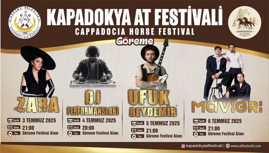 1.Uluslararası Kapadokya At Festivali başladı! Doğanın, tarihin ve atların büyülü buluşmasına tanıklık etmeye hazır mısın? Festival boyunca geleneksel atlı gösteriler, yerel el sanatları stantları, konserler ve renkli etkinliklerle unutulmaz bir deneyim seni bekliyor. Eşsiz peri bacaları manzarası eşliğinde hem kültür hem eğlence dolu anlar yaşamak istiyorsan, bu festivali kaçırma!