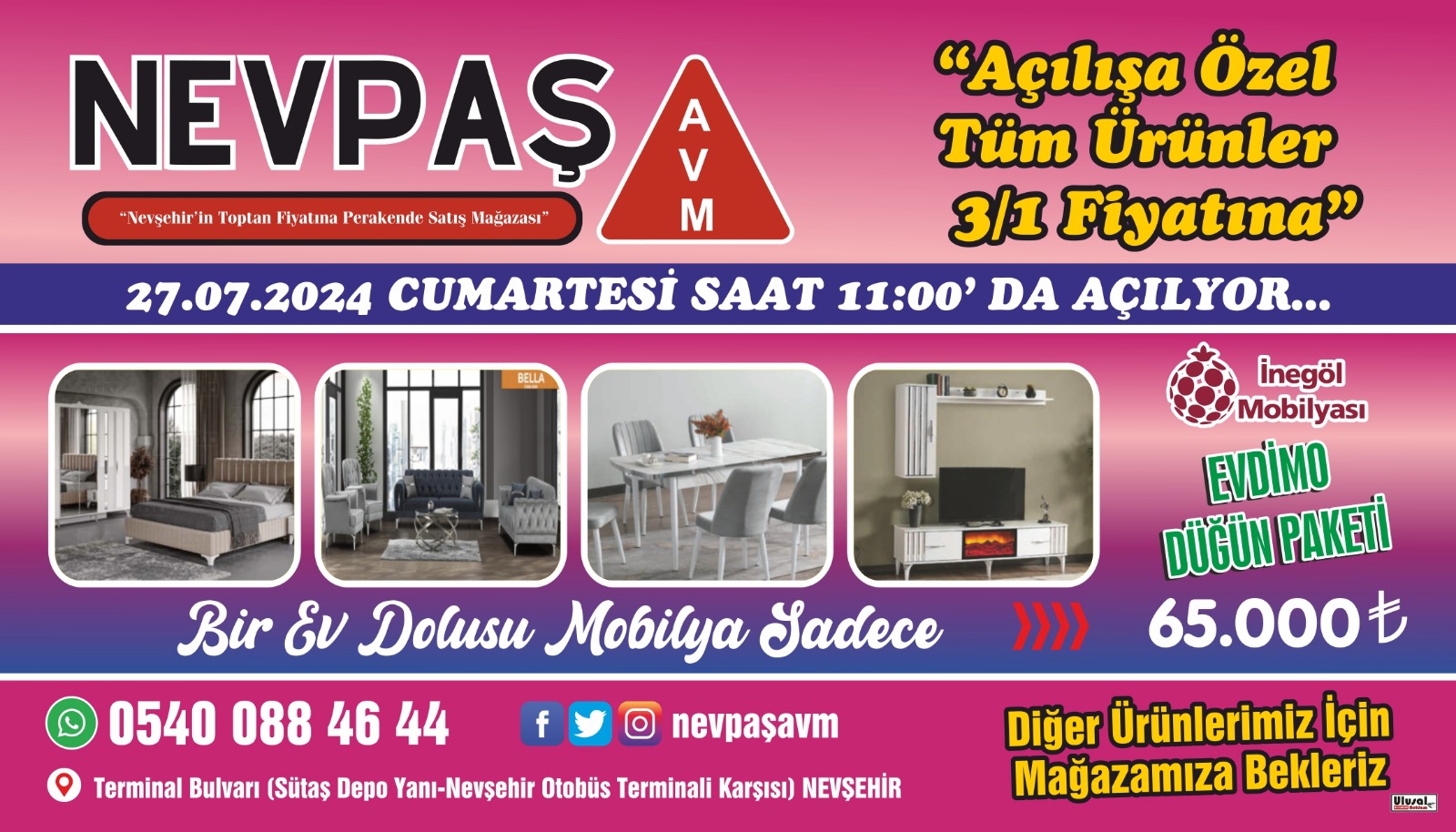 Nevşehir'in Toptan fiyatına Perakende satış mağazası Nevpaş AVM Nevşehir'de açılıyor. Açılışa özel neredeyse tüm mobilya gruplarının 3'te 1 fiyatına satıldığı mağazada birçok çeşidi de bir arada bulabileceksiniz. Hiçbir yerde bulamayacağınız Düğün paketinde Yatak odası, Oturma odası, Mutfak masası ve salon takımlarından oluşan Evdimo paket 65.000 ₺'den satışa sunulacak. Terminal kavşağında yeni yerinde 27.07.2024 tarihinde saat 11.00'da kapılarını müşterilerine açacak olan Nevpaş AVM' nin birbirinden özel ürünlerini görmek ve kampanyalardan yararlanmak için mağazasını ziyaret edebilir veya 0540 088 46 44 nolu numarayı arayabilirsiniz.