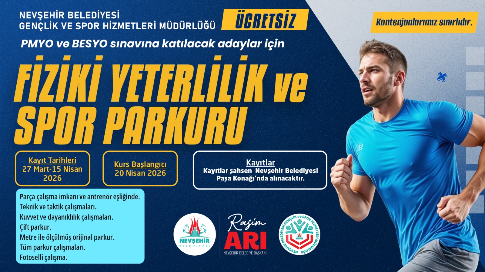 Nevşehir Belediyesi, Polis Meslek Yüksek Okulu (PMYO) ve Beden Eğitimi ve Spor Yüksek Okulu (BESYO) sınavlarına hazırlanan gençler için önemli bir projeyi hayata geçiriyor. Belediye, adayların fiziki yeterlilik sınavlarına daha iyi hazırlanabilmesi amacıyla ücretsiz “Fiziki Yeterlilik ve Spor Parkuru” kursu açacak.