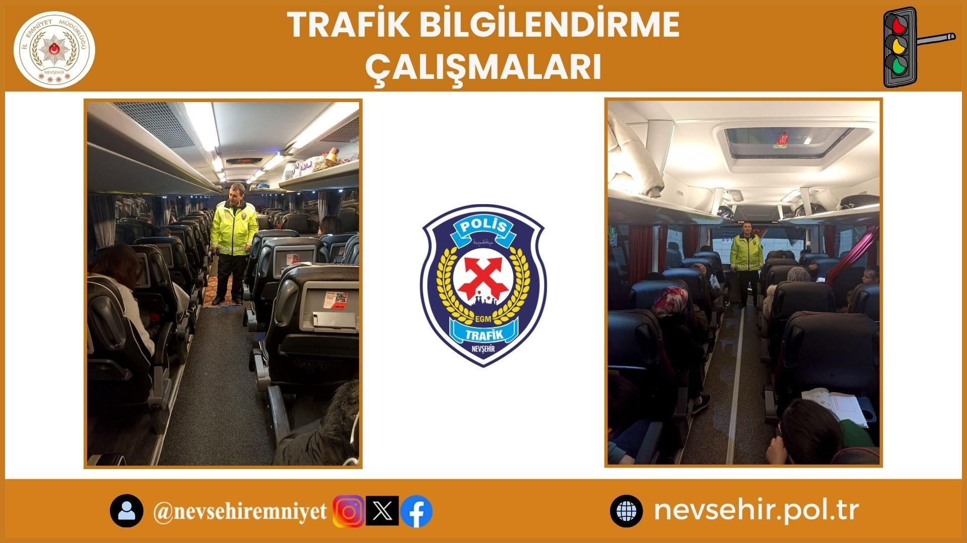 Trafik eğitim ve bilgilendirme faaliyetleri kapsamında, Nevşehir Şehirlerarası Otobüs Terminali’nde şehirlerarası yolcu taşımacılığı yapan otobüsler ve şoförler denetlendi. Ayrıca, otobüs içerisinde bulunan yolculara, araç içerisinde emniyet kemerinin önemi ve doğru kullanımı konusunda eğitim ve bilgilendirme çalışmaları yapıldı. Bu faaliyetler, trafik güvenliğini artırmak ve yolcuların emniyet kemeri kullanımına yönelik farkındalık oluşturmak amacıyla gerçekleştirildi.