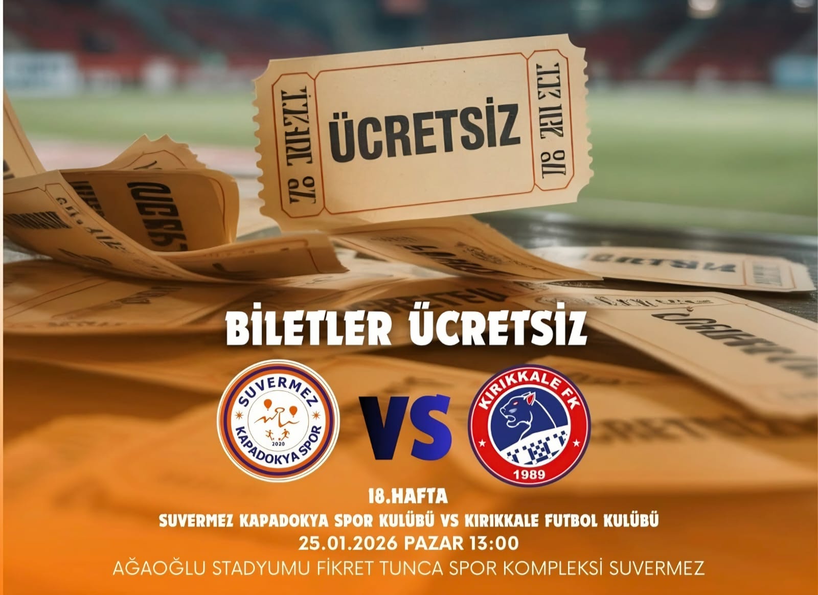 Suvermez Kapadokya Spor Kırıkkale FK'yi ağırlayacak TFF 3. Lig 2. Grup’ta 18. haftada, Suvermez Kapadokya Spor, kendi sahasında Kırıkkale FK ile karşı karşıya oynayacak. Karşılaşma, 25 Ocak 2026 Pazar günü saat 13.00’te, Suvermez köyü Fikret Tunca Spor Çim Sahasında oynanacak.