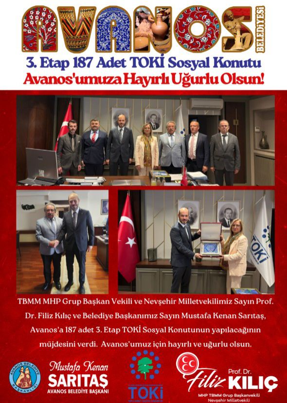 TBMM MHP Grup Başkanvekili ve Nevşehir Milletvekilimiz Sayın Prof. Dr. Filiz Kılıç ve Belediye Başkanımız Sayın Mustafa Kenan Sarıtaş, Avanos’a 187 adet 3. Etap TOKİ Sosyal Konutunun yapılacağının müjdesini verdi.