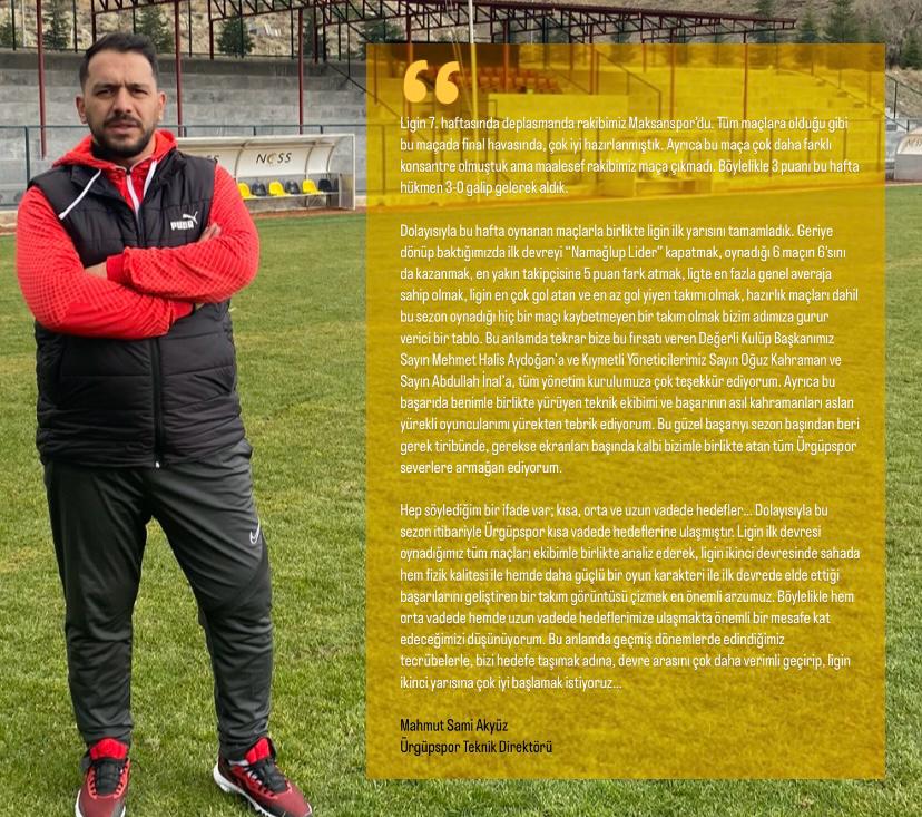 Dolayısıyla bu hafta oynanan maçlarla birlikte ligin ilk yarısını tamamladık. Geriye dönüp baktığımızda ilk devreyi “Namağlup Lider” kapatmak, oynadığı 6 maçın 6’sını da kazanmak, en yakın takipçisine 5 puan fark atmak, ligte en fazla genel averaja sahip olmak, ligin en çok gol atan ve en az gol yiyen takımı olmak, hazırlık maçları dahil bu sezon oynadığı hiç bir maçı kaybetmeyen bir takım olmak bizim adımıza gurur verici bir tablo. Bu anlamda tekrar bize bu fırsatı veren Değerli Kulüp Başkanımız Sayın Mehmet Halis Aydoğan’a ve Kıymetli Yöneticilerimiz Sayın Oğuz Kahraman ve Sayın Abdullah İnal’a, tüm yönetim kurulumuza çok teşekkür ediyorum. Ayrıca bu başarıda benimle birlikte yürüyen teknik ekibimi ve başarının asıl kahramanları aslan yürekli oyuncularımı yürekten tebrik ediyorum. Bu güzel başarıyı sezon başından beri gerek tribünde, gerekse ekranları başında kalbi bizimle birlikte atan tüm Ürgüpspor severlere armağan ediyorum.