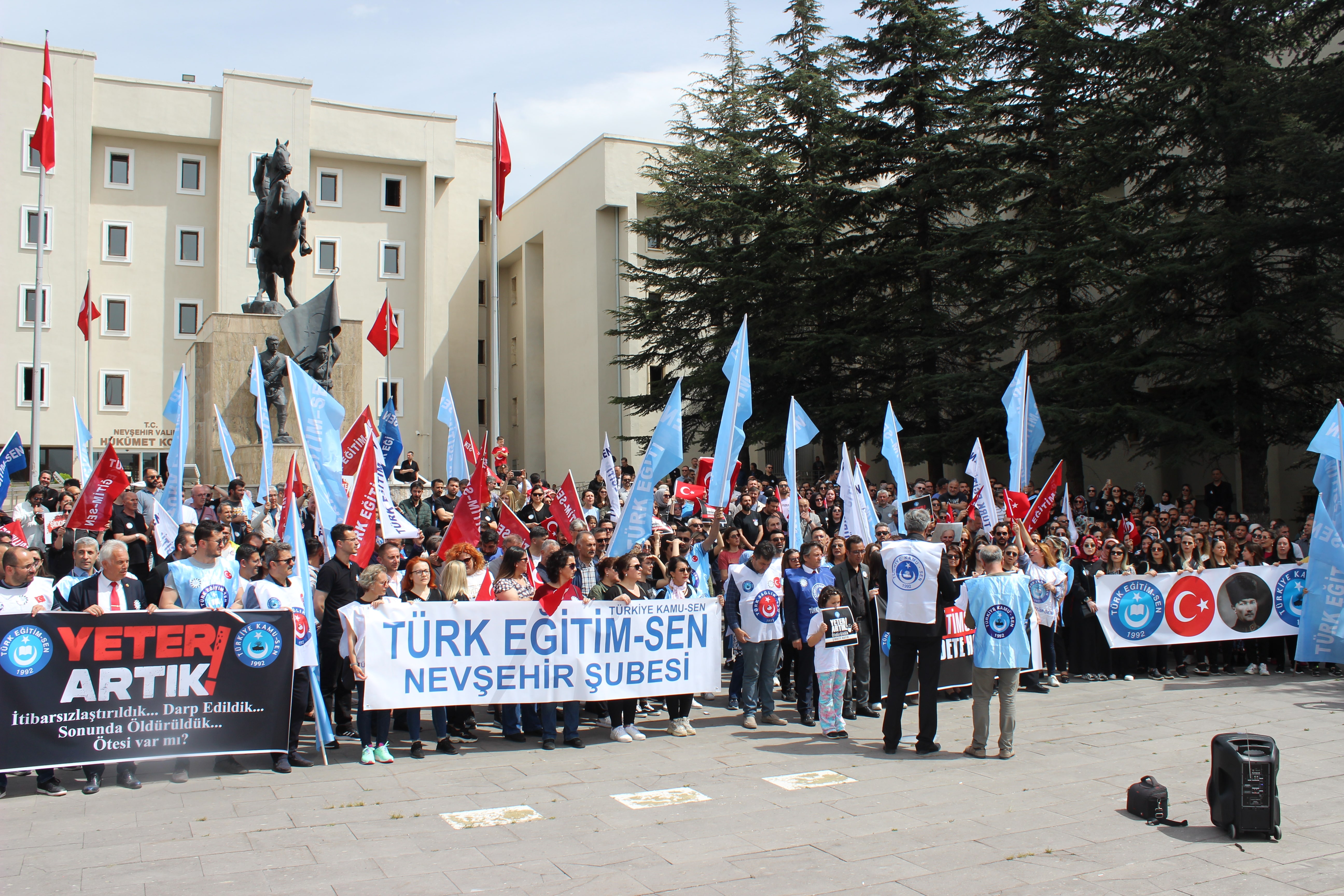 Türk Eğitim Sen Nevşehir Şubesi üyeleri Türk Eğitim Sen Genel Merkezinin ülke genelinde aldığı İş Bırakma Eylemiyle bugün okullara gitmediler Nevşehir Valiliği Atatürk Anıtı önünde yaklaşık 1000 eğitim çalışanı toplanarak saat:14.00’da tarihi bir kalabalıkla eylem gerçekleştirdiler. Başta vefat eden İbrahim öğretmenimiz, olmak üzere tüm şehit öğretmenlerimiz ve ülkemizin kurucusu Atatürk için saygı duruşu ve dua yapıldı. İstiklal marşı okundu. “Artık Yeter! Öldürüldük. Şiddete Hayır! Öldürürsen öğretemem! Beni Öldürende yoktur din iman, İtibarsızlaştırıldık, darp edildik var mı ötesi, Eğitimciye Şiddete Hayır pankartları dikkat çekti. Ayrıca açıklamalar esnasında toplanan kalabalık Güvenli eğitim güvenli gelecek, Vatandaş uyuma öğretmenine sahip çık, eğitimciyiz haklıyız kazanacağız, Şiddete karşı omuz omuza, Öğretmene uzanan eller kırılsın. Eğitimciler burada yaptırımlar nerede, Bakanım bir bak öldürüldük. İşte memur İşte sendika, Okullara Güvenlik Görevlisi İstiyoruz. Öğretmenler burada sayın Tekin nerede! Eğitimci eğilme dik dur sendikan seninle sloganları topluluk tarafından bir ağızdan söylendi. Eylem sonunda eyleme katılan eğitim çalışanları ve öğretmenler belediye caddesine kadar yürüyüş gerçekleştirdiler.
