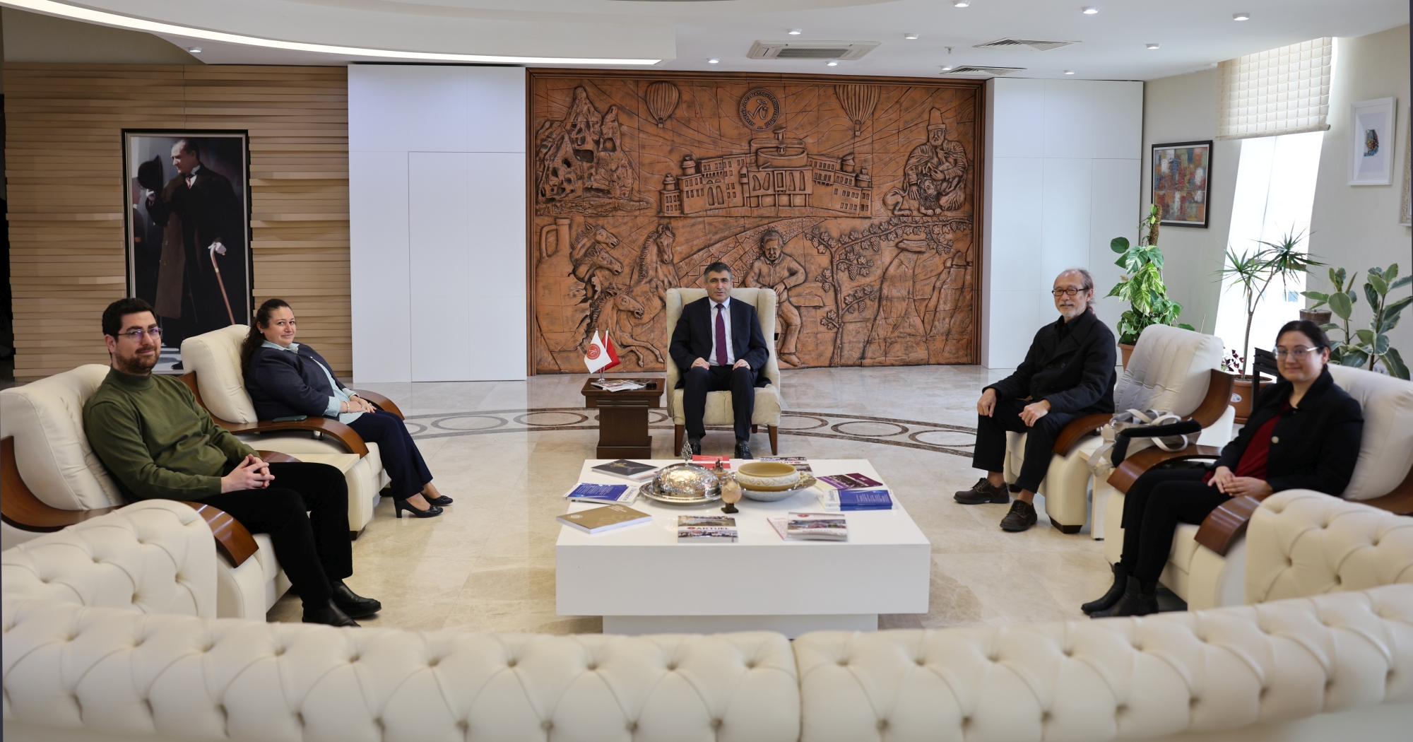 TÜBİTAK 2221 Programı kapsamında Nevşehir Hacı Bektaş Veli Üniversitesi (NEVÜ)’ye konuk araştırmacı olarak gelen Ritsumeikan Asya-Pasifik Üniversitesi Asya-Pasifik Çalışmaları Fakültesi öğretim üyesi Prof. Dr. Yoichiro Sato, NEVÜ Uluslararası İlişkiler Bölümü tarafından düzenlenen “ABD'nin Stratejik Düşüncesi, Trump Yönetimi'nde Asya ve Avrupa'da İttifak Yönetimi (US Strategic Thoughts, Trump Administration, and Alliance Management in Asia and Europe)” başlıklı seminer öncesinde, Rektör Prof. Dr. Semih Aktekin’i makamında ziyaret etti.