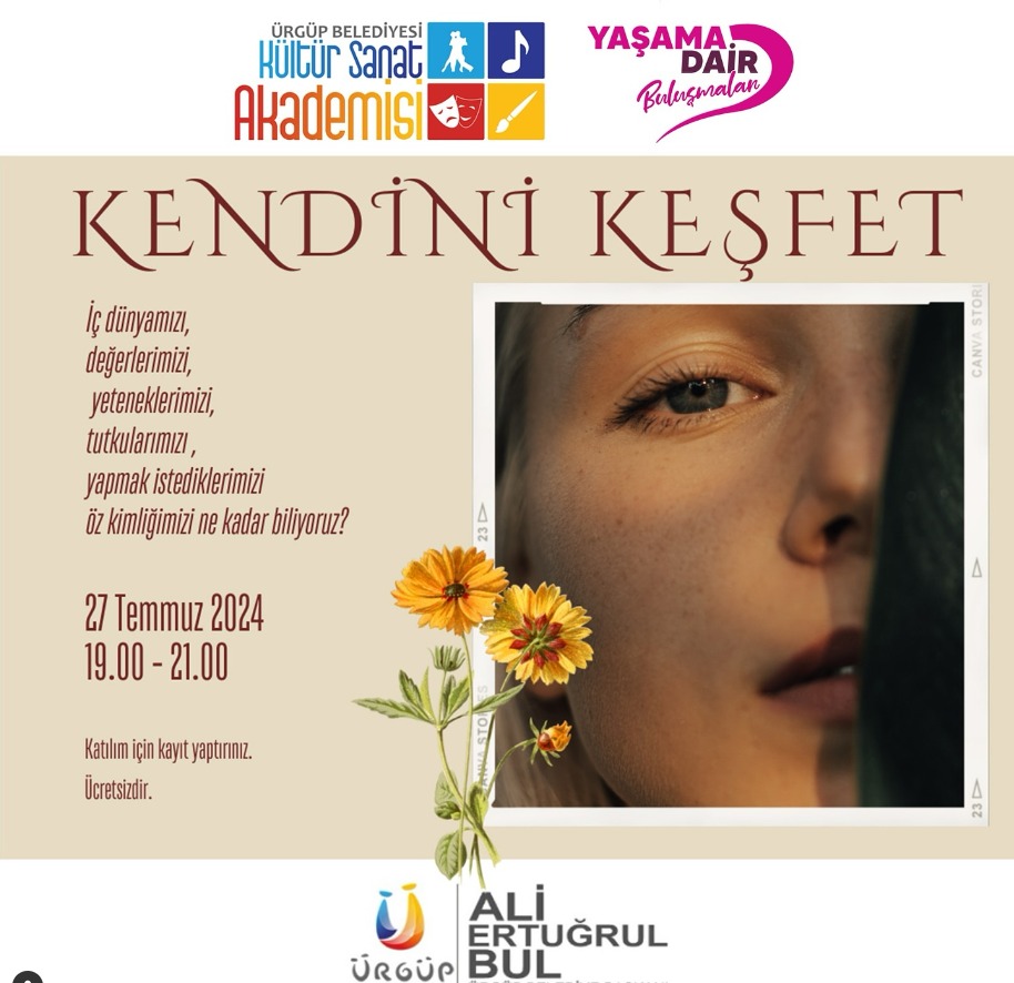 Hayatımızın en değerli yolculuğuna birlikte çıkmaya davetlisiniz. Sn. Arzu Sakızlı'nın moderatörlüğünde gerçekleşecek "Kendini Keşfet" buluşmasında, daha mutlu, tatmin edici ve amaçlı bir yaşam sürmek için potansiyelimizi keşfetmenin, kendimizi gerçekleştirmenin ilk adımlarını atacağız.