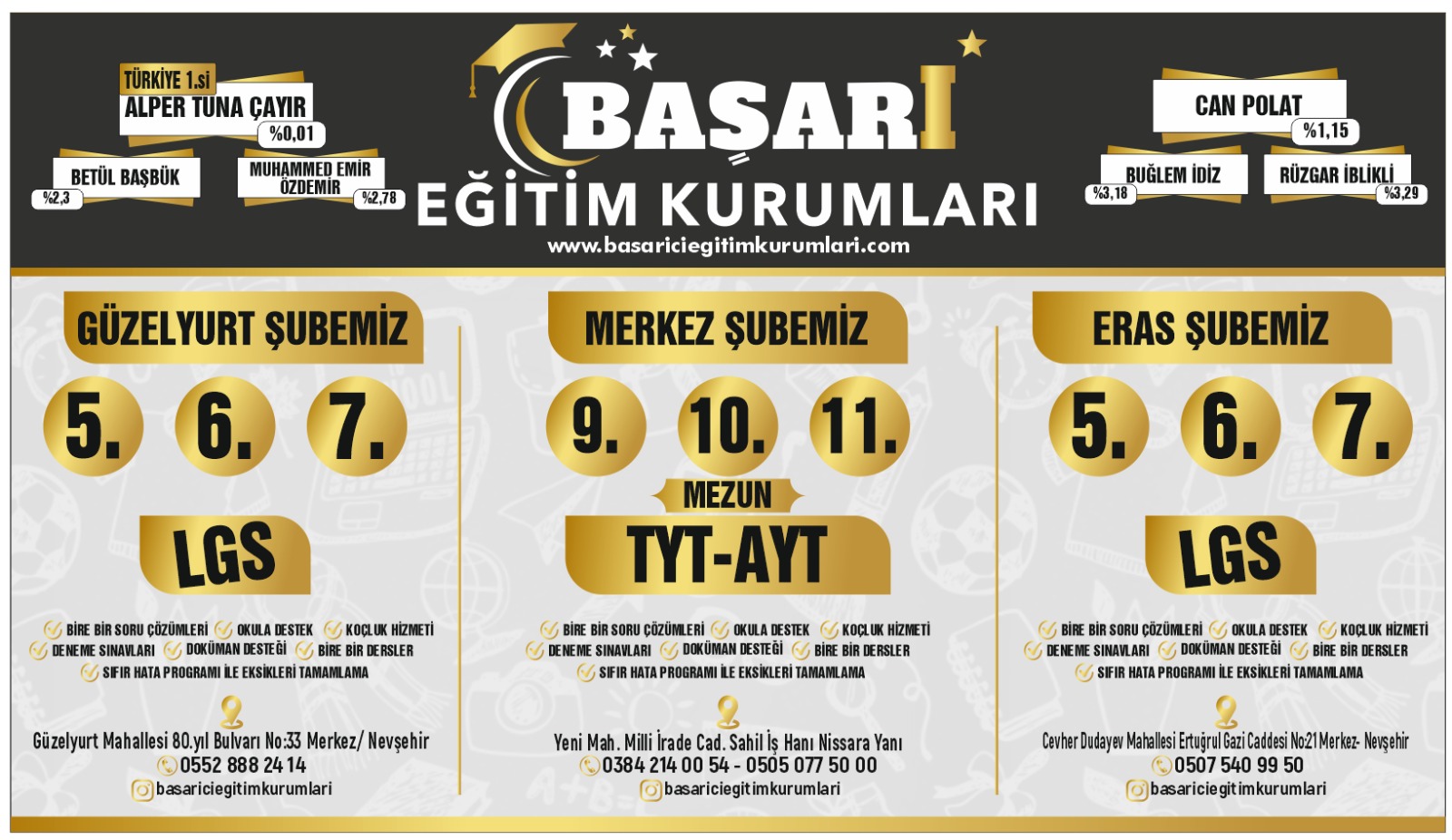 Nevşehir’de eğitimde kalite ve başarıyı bir arada sunan Başarı Eğitim Kurumları, her yıl olduğu gibi bu yıl da adından söz ettiriyor. Türkiye genelinde derece yapan öğrencileriyle dikkat çeken kurum, farklı yaş gruplarına yönelik özel programları ve üç ayrı şubesiyle öğrencilere nitelikli eğitim imkânı sunuyor.