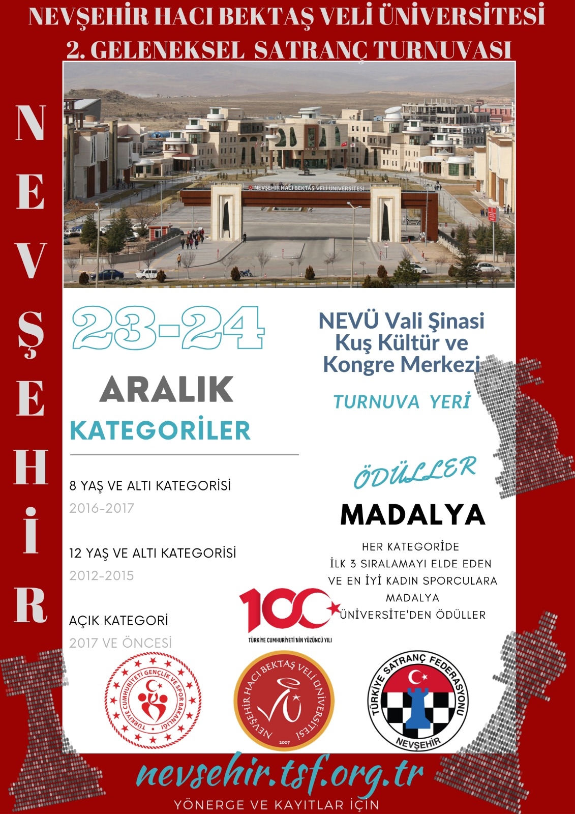 “Türkiye Cumhuriyeti’nin 100. Yılı” etkinlikleri kapsamında Nevşehir Hacı Bektaş Veli Üniversitesi (NEVÜ) iş birliği ve ev sahipliğinde “2. Geleneksel Satranç Turnuvası” düzenlenecek.