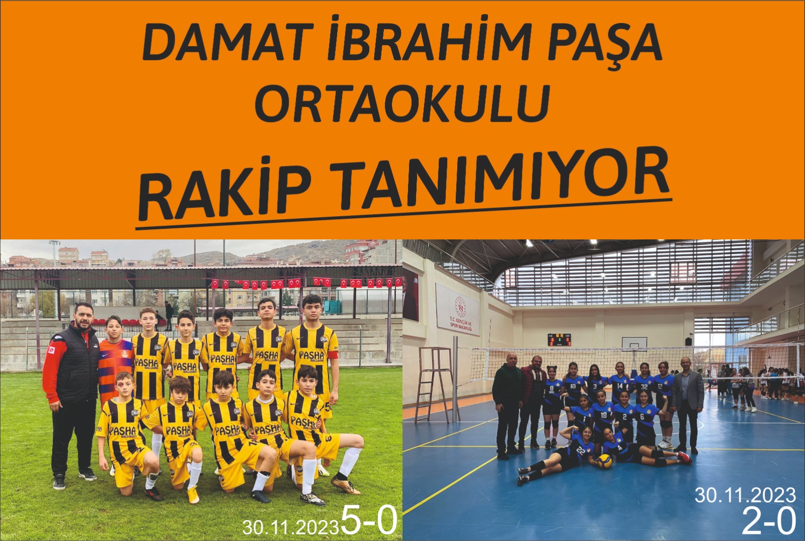 2023/2024 Egitim öğretim yılı okul sporları kapsaminda yapılan Futbol ve Voleybol müsabakaları devam ediyor. Gençlik Spor il Müdürlüğü 2000 Evler çok amaçlı spor salonunda yapılan Voleybol müsakalarında Turnuvanın 3. gününde çekişmeli maçlar oynandı . 3 gündür devam eden müsabakalarda Damat İbrahim Paşa Ortaokulu Voleybol takımı grupta oynadığı üç maçı da 2-0 kazanarak grup 1.si oldu.Oyunuyla tüm dikkatleri üzerine çeken takım oldu.