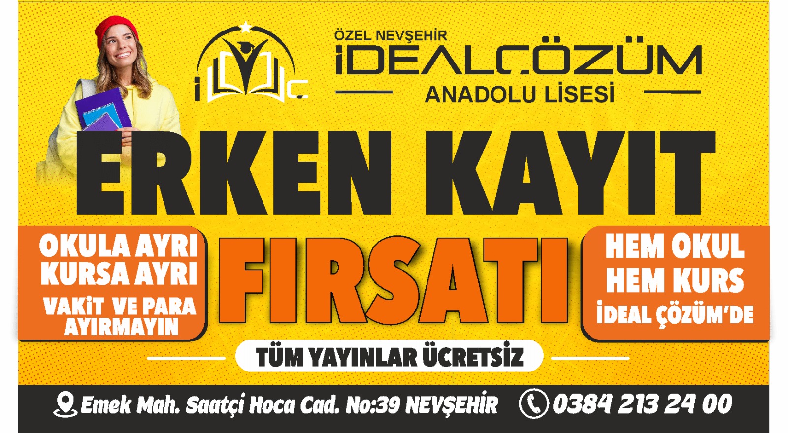 Özel Nevşehir İdeal Çözüm Anadolu Lisesi, hem okul hem kurs avantajını tek çatı altında sunarak büyük bir fırsat sağlıyor! Erken kayıt dönemi başladı. Bu özel fırsatlardan faydalanmak isteyen öğrenci ve veliler için kaçırılamaz avantajlar sunuluyor. Okula ayrı, kursa ayrı vakit ve para ayırmayın! İdeal Çözüm Anadolu Lisesi, akademik başarıyı ön planda tutmaya devam ederek bütünleşik bir eğitim modeli sunuyor. Ayrıca öğrencilerin her hangi bir kursa gitmelerinede gerek yok hem lise eğitimlerini hem de sınav hazırlıklarını tek çatı altında tamamlayabiliyorlar. Tüm yayınlar ücretsiz! Erken kayıt yaptırmak için tüm eğitim seçenekleri ücretsiz olarak sunulmaktadır.