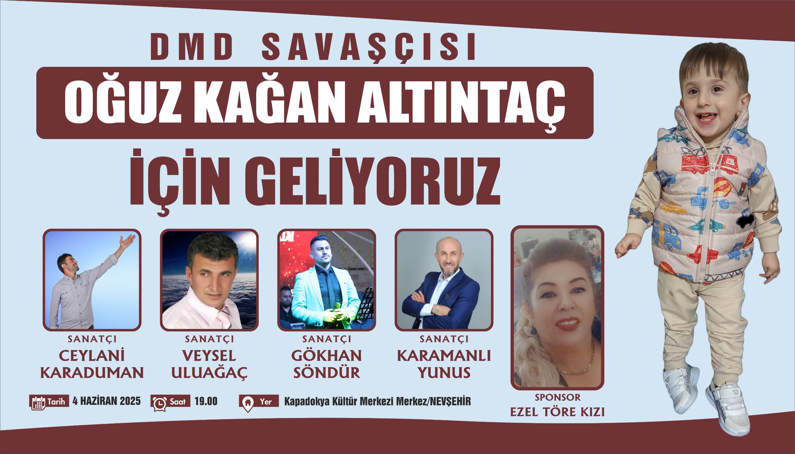 Nevşehir, 4 Haziran 2025 tarihinde anlamlı bir etkinliğe ev sahipliği yapacak. Duchenne Musküler Distrofi (DMD) hastalığıyla mücadele eden Oğuz Kağan adlı minik bir hasta için düzenlenecek konser ve kermes organizasyonu, tedavi sürecine maddi destek sağlamayı hedefliyor.