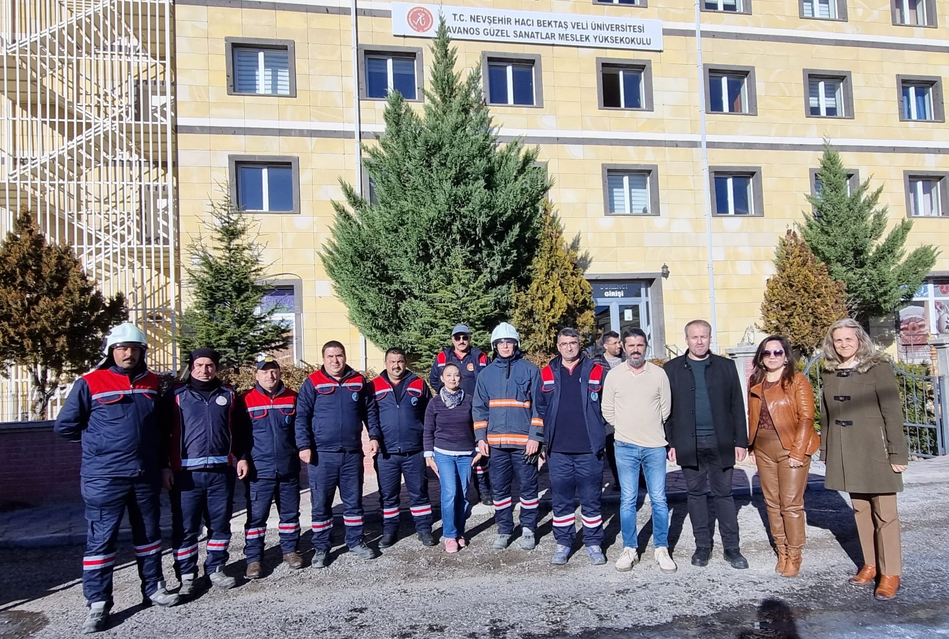 NEVÜ Avanos Güzel Sanatlar Meslek Yüksekokulu, Avanos Belediyesi iş birliğiyle “İş Sağlığı ve Güvenliği” kapsamında, İtfaiye Eri Mustafa Demir yönetiminde itfaiye ekibi tarafından uygulamalı yangın eğitimi gerçekleştirildi. Yüksekokul Müdürü Öğr. Gör. Bahadır Cem Erdem, müdür yardımcıları, yüksekokul sekreteri, bölüm başkanları, öğretim elemanları ve öğrencilerin katılımıyla gerçekleştirilen eğitimde, olası bir yangın durumunda yapılması gerekenler ve yangın ekipmanlarının doğru kullanımı Avanos Belediyesi itfaiyesi ekibi tarafından uygulamalı olarak anlatıldı.