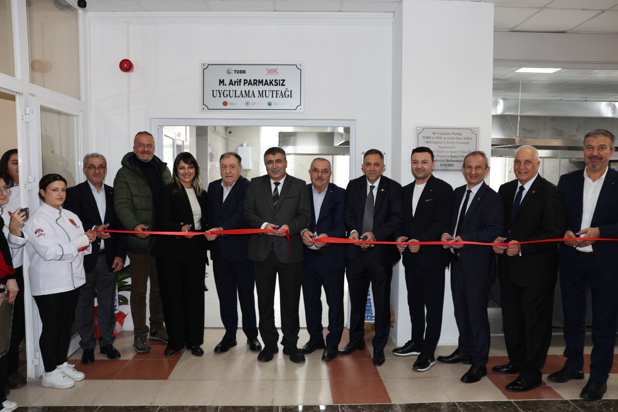 Türkiye Odalar ve Borsalar Birliği (TOBB) ile Yükseköğretim Kurulu (YÖK) arasında imzalanan MYO Eğitim ve İş Birliği Protokolü kapsamında hayata geçirilen uygulama mutfağının açılışına; NEVÜ Rektörü Prof. Dr. Semih Aktekin, Kapadokya Üniversitesi (KÜN) Rektörü Prof. Dr. Hasan Ali Kasar, Nevşehir Ticaret ve Sanayi Odası Başkanı M. Arif Parmaksız, NEVÜ Rektör Yardımcısı Prof. Dr. Bayram Deviren, Ürgüp Ticaret ve Sanayi Odası Başkanı Ahmet Aydın, NEVÜ Genel Sekreteri Nihat Çavuşoğlu, ÜSET Müdürü Doç. Dr. Lokman Tanrıkulu, akademik ve idari personel, öğrenciler ile davetliler katıldı.