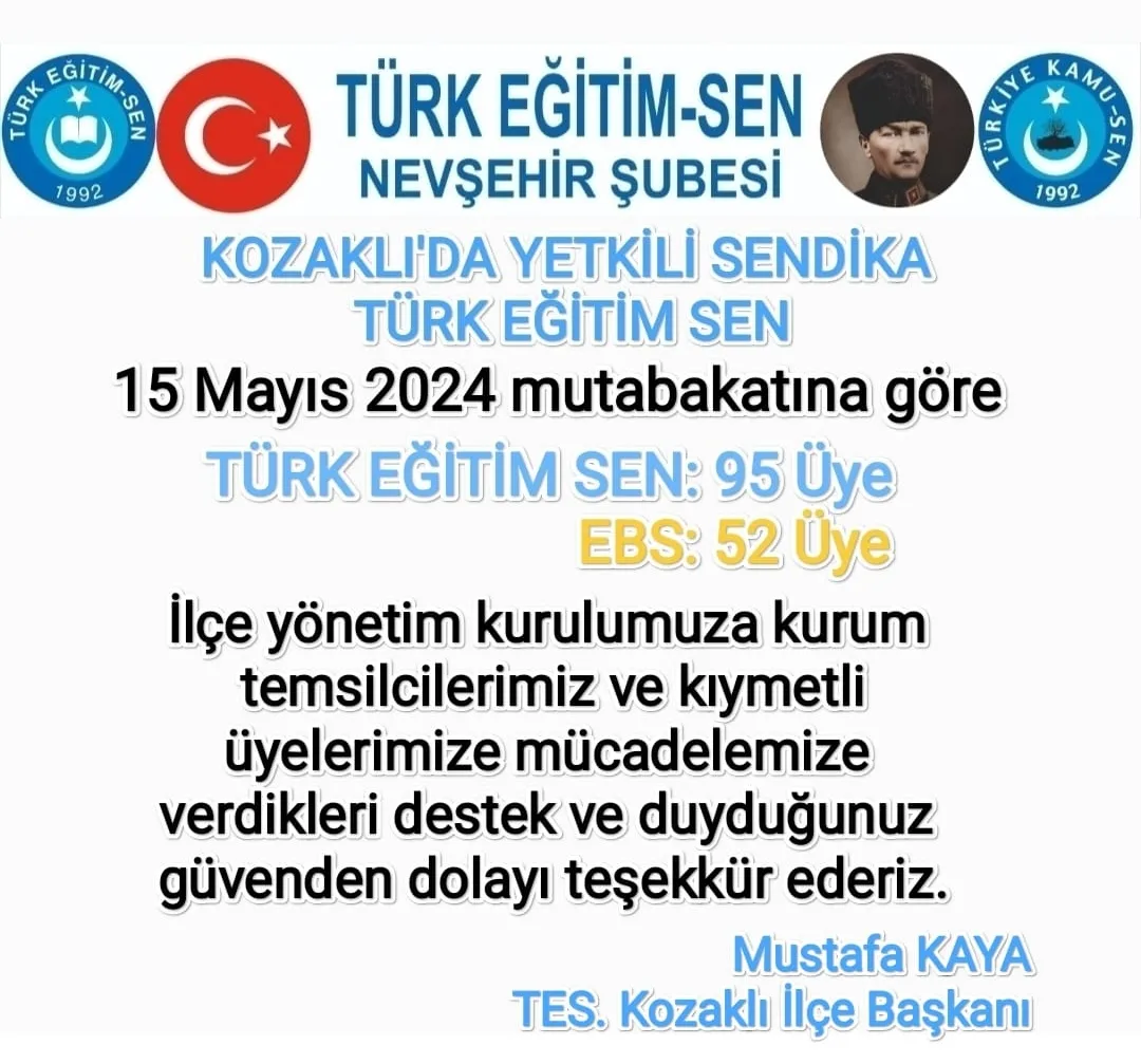 Türk Eğitim Sen Nevşehir şubesinden yapılan açıklamalarda; Türk Eğitim Sen'i yetkili kılan değerli eğitim çalışanlarına, kıymetli üyelerimize, kurum temsilcilerimize, kadın komisyonumuza, il ve ilçe yönetim kurullarımıza sendikal mücadelemize vermiş oldukları desteklerden dolayı teşekkür ederiz. İnsanı yaşat ki devlet yaşasın ilkesi ile etkili ve yetkili sendika olarak mücadelemizi devam ettireceğiz. İfadeleri kullanıldı.