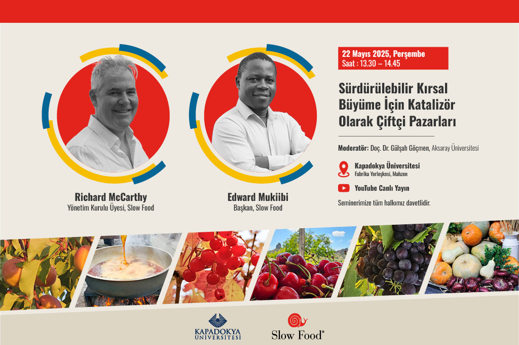 Slow Food Uluslararası Konseyi Başkanı Edward Mukiibi, Yönetim Kurulu Üyeleri, Slow Food Uluslararası Konseyi Genel Sekreteri ve Türkiye’den temsilcilerin katılımıyla düzenlenecek seminerlerde bilgi ve deneyimlerini paylaşacaklar. Kapadokya Üniversitesinin çeşitli kampüslerinde yapılacak seminerler herkese açık, aynı zamanda Kapadokya Üniversitesinin YouTube kanalından da canlı olarak izlenebilecek.