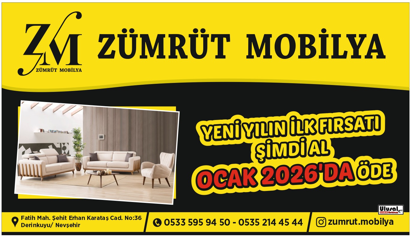 Zümrüt Mobilya, 2026 yılına özel büyük bir kampanya başlattı. Derinkuyu’da mobilyacılık mağazası bulunan Zümrüt Mobilya, eski mobilyalarından memnun olmayan veya yeni mobilya almak isteyen vatandaşlar için kaçırılmayacak fırsatlar sunuyor. Yeni yılın ilk büyük kampanyası kapsamında, müşteriler “Şimdi Al, Ocak 2026’da Öde” fırsatından yararlanarak istedikleri mobilyalara hemen sahip olabiliyorlar. Zümrüt Mobilya, kampanya için müşterilerini mağazasına davet ederek, bu büyük fırsatın keyfini çıkarmalarını öneriyor.