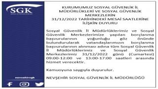 SGK İl Müdürlüğü cumartesi gün boyu açık olacakNevşehir Sosyal güvenlik il müdürlüğünden yapılan açıklama ile yarın da il müdürlüğü Askerlik borçlanması işlemlerinin yapılması için mesai yapacak